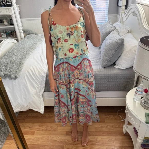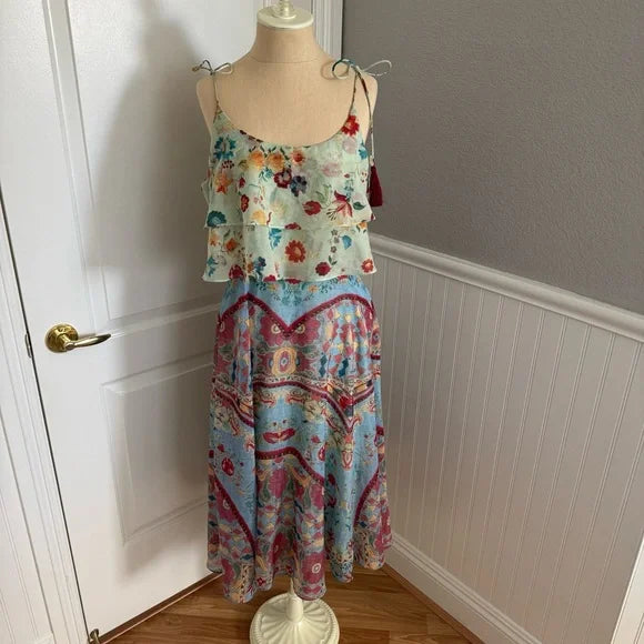 Channel effortless elegance with this stunning Anthropologie Eros Tasseled Kerchief Midi Dress by Hemant & Nandita. Featuring intricate detailing and playful tasseled accents, this dress exudes beautiful Spanish-inspired vibes and romantic charm.