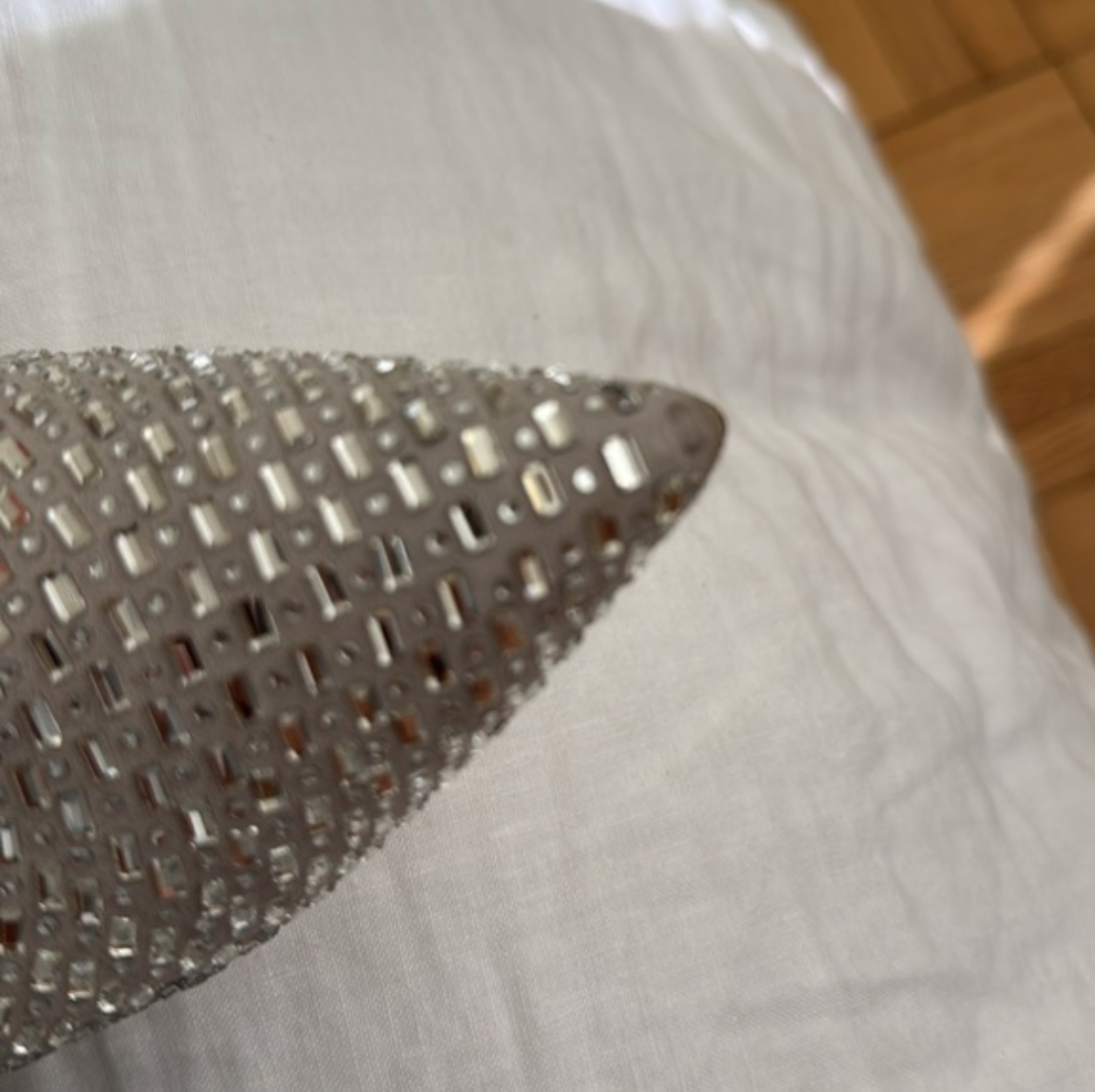 Stunning bedazzled sequin pointed closed-toe heels that add instant glamour to any outfit. These dazzling heels feature shimmering sequins and sparkling gem accents for a truly eye-catching look. Lightly worn and in excellent condition, they bring elegance and sparkle to special occasions, nights out, or festive events.